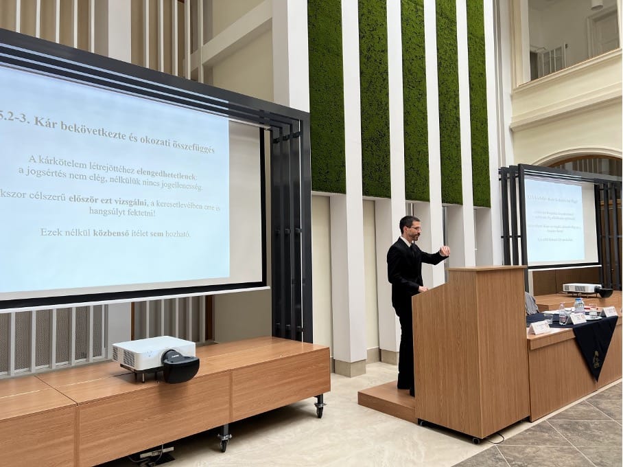 Prof. Dr. Fuglinszky Ádám, az ELTE Állam- és Jogtudományi Karának egyetemi tanára a kontraktuális felelősség aktuális kérdéseit tekintette át előadásában. Az előkérdések körében áttekintve a szerződésszegés, a gondossági kötelmek és a kár kérdéseinek aktuális joggyakorlatát, majd a kimentési okokat.