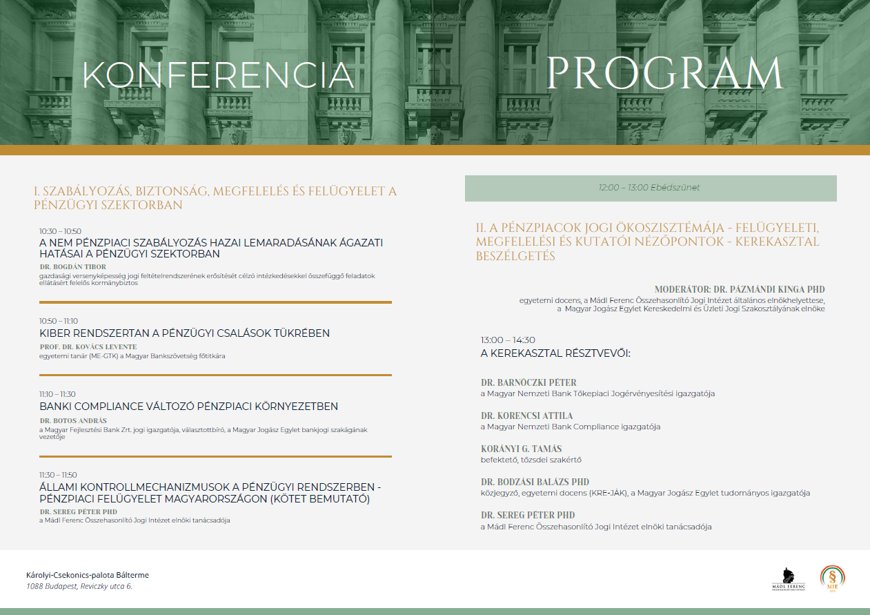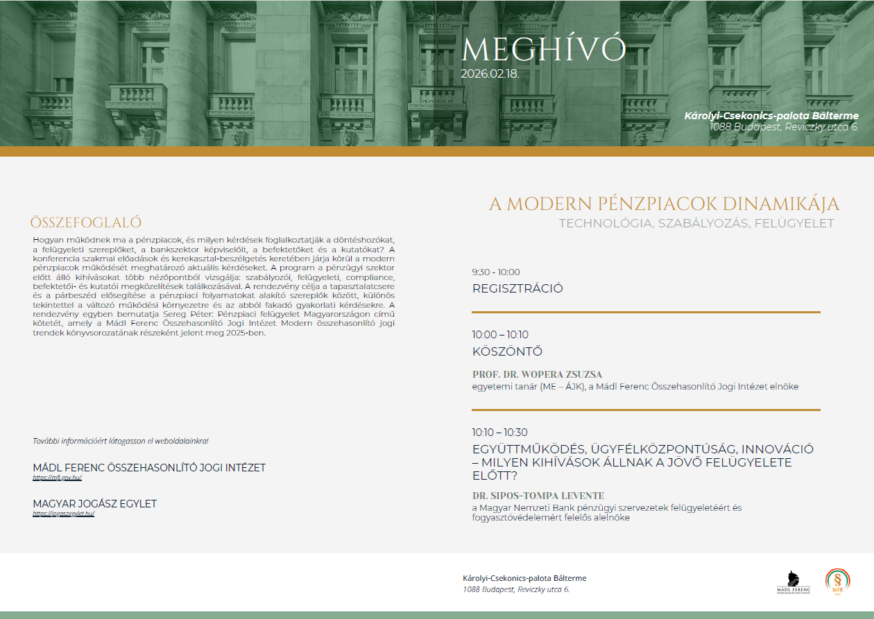 Hogyan alakítja a technológiai fejlődés, a szabályozás és a felügyeleti gyakorlat a pénzpiacok működését? Milyen kihívásokkal szembesülnek ma a döntéshozók, a felügyeleti szervek, a pénzügyi intézmények és a befektetők? E kérdésekre keresi a választ „A modern pénzpiacok dinamikája” című szakmai konferencia, amelyre 2026. február 18-án kerül sor a Károlyi–Csekonics-palota báltermében. A rendezvény előadások és kerekasztal-beszélgetés keretében mutatja be a pénzügyi szektor aktuális folyamatait, különös tekintettel a szabályozási, felügyeleti és megfelelési szempontokra. A konferencia lehetőséget teremt a szakmai párbeszédre a pénzpiacokat alakító szereplők között, valamint bemutatásra kerül Sereg Péter: Pénzpiaci felügyelet Magyarországon című kötete is. A rendezvényt a Mádl Ferenc Összehasonlító Jogi Intézet és a Magyar Jogász Egylet szervezi.