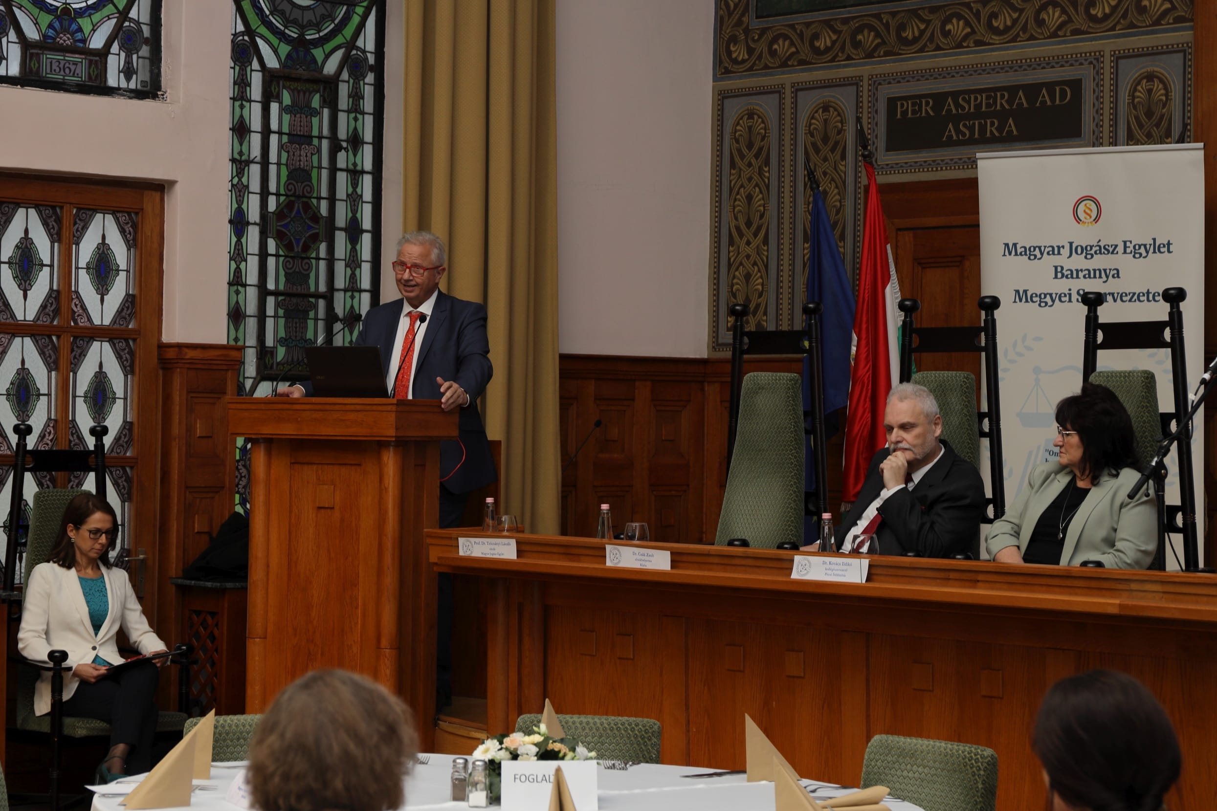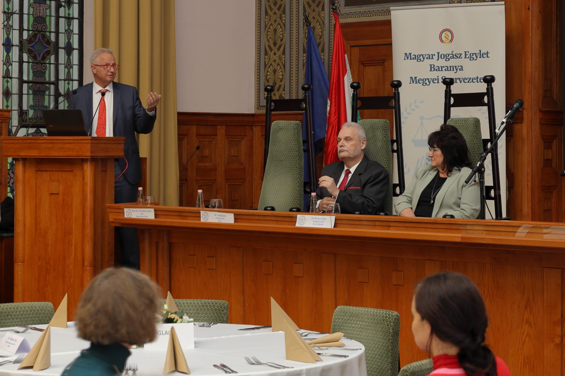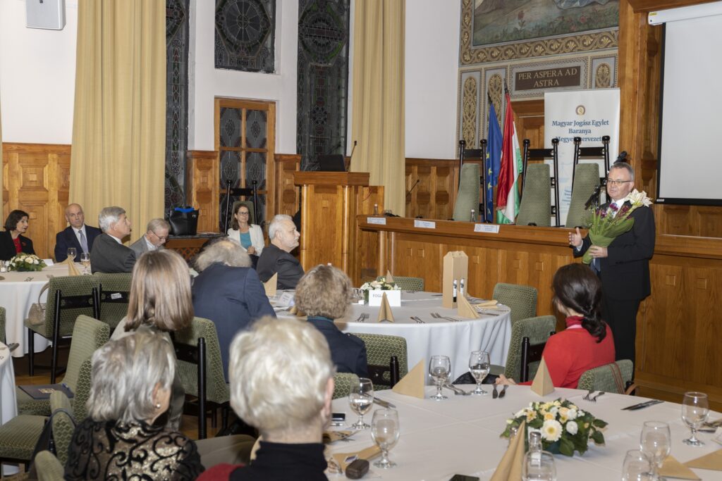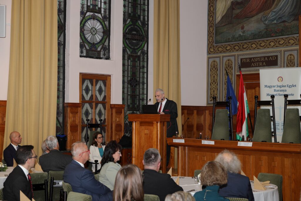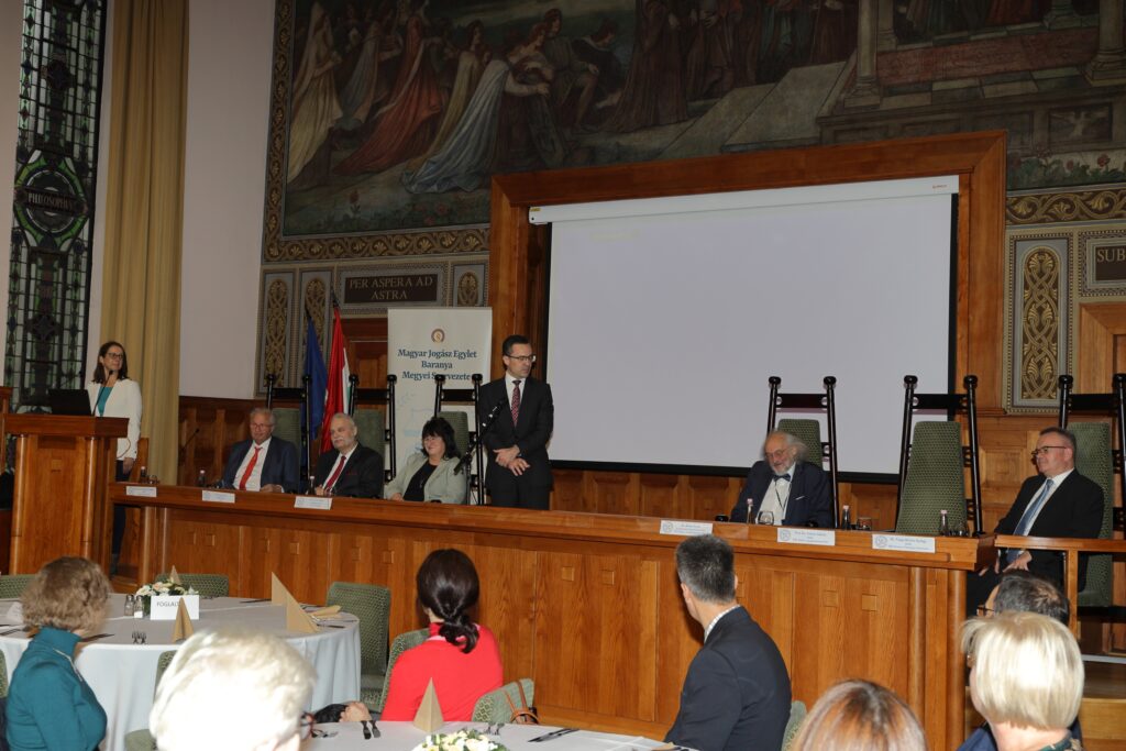 A rendezvény több, mint 100 fő résztvevőjét a MJE Baranya Vármegyei Szervezet elnöke Dr. Varga-Koritár György, valamint a Pécsi Tudományegyetem Állam- és Jogtudományi Kar dékánja Prof. Dr. Fábián Adrián köszöntötte.