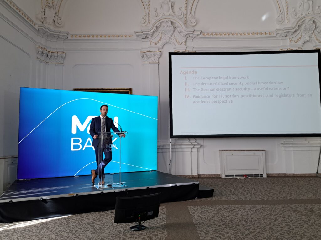 Prof. Dr. David Bartlitz (egyetemi tanár, Universität Paderborn, Lehrstuhl für Deutsches und Internationales Unternehmensrecht) angol nyelvű előadásában összehasonlította a dematerializált értékpapírokra vonatkozó magyarországi szabályozást a Németországban 2021-ben elfogadott elektronikus értékpapírokról szóló törvénnyel (Gesetz über elektronische Wertpapiere vom 3. Juni 2021, eWpG).