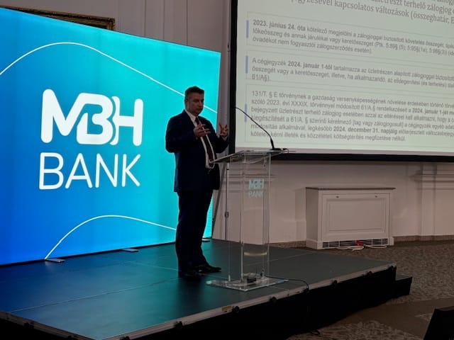 Dr. Borbély Gábor ügyvéd (partner, DLA Piper Posztl, Nemescsói, Györfi‑Tóth & Társai Ügyvédi Iroda) előadásában a vállalatfinanszírozás aktuális kérdéseit elemezte. A zálogjogi szabályozással kapcsolatban a Ptk. 2023. évi módosítását emelte ki, amely – többek között – előírta, hogy a zálogszerződésben valamilyen összeget a feleknek meg kell jelölniük. Ez lehet a biztosított követelés összege – amely akár keretösszegként is megjelölhető –, de lehet az az összeg is, amelynek erejéig a zálogjogosult a zálogtárgyból kielégítést kereshet. Ez utóbbi a Ptk. 5:98. § (3) bekezdése alapján mindig egy keretösszeg. A zálogszerződésben így megjelölt összeget a cégnyilvántartásban is fel kell tüntetni, ha a zálogtárgy kft. üzletrész.
