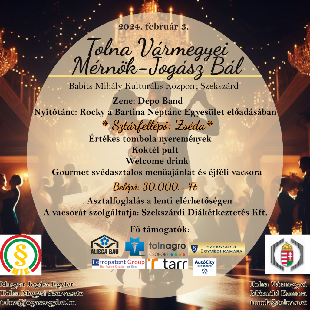 A Magyar Jogász Egylet Tolna Megyei Szervezete és a Tolna Vármegyei Mérnöki Kamara Mérnök-Jogász Bált szervez 2024. február 3-án.