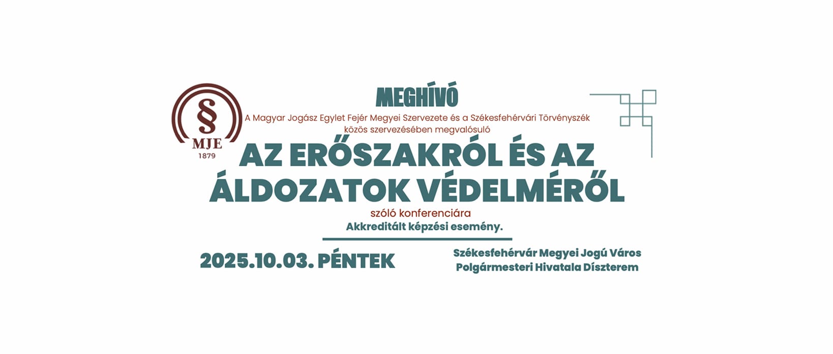A Magyar Jogász Egylet Fejér Megyei Szervezete és a Székesfehérvári Törvényszék közös szervezésében tartja meg közös konferenciáját Az erőszakról és az áldozatok védelméről 2025.október 03. (péntek) napján a Székesfehérvár Megyei Jogú Város